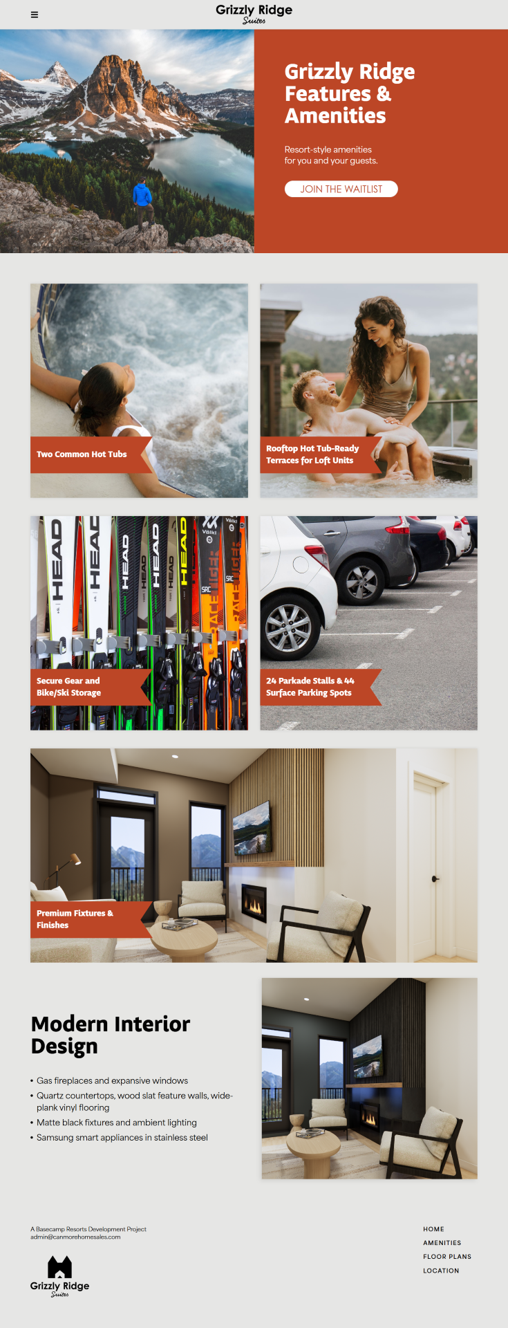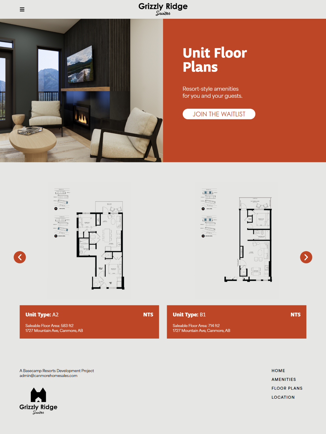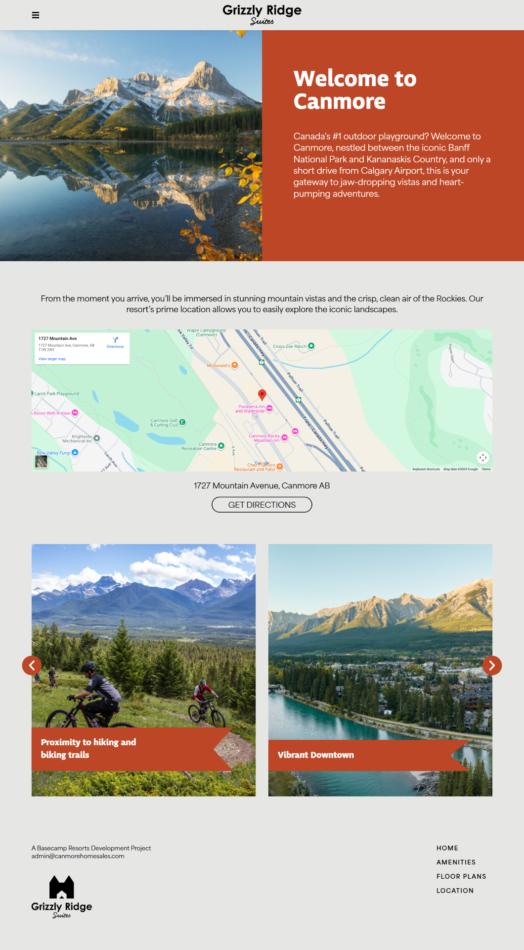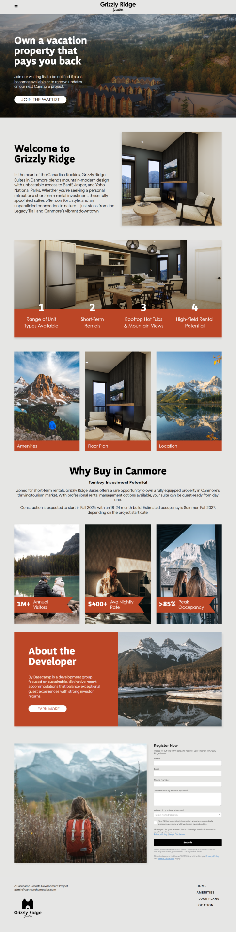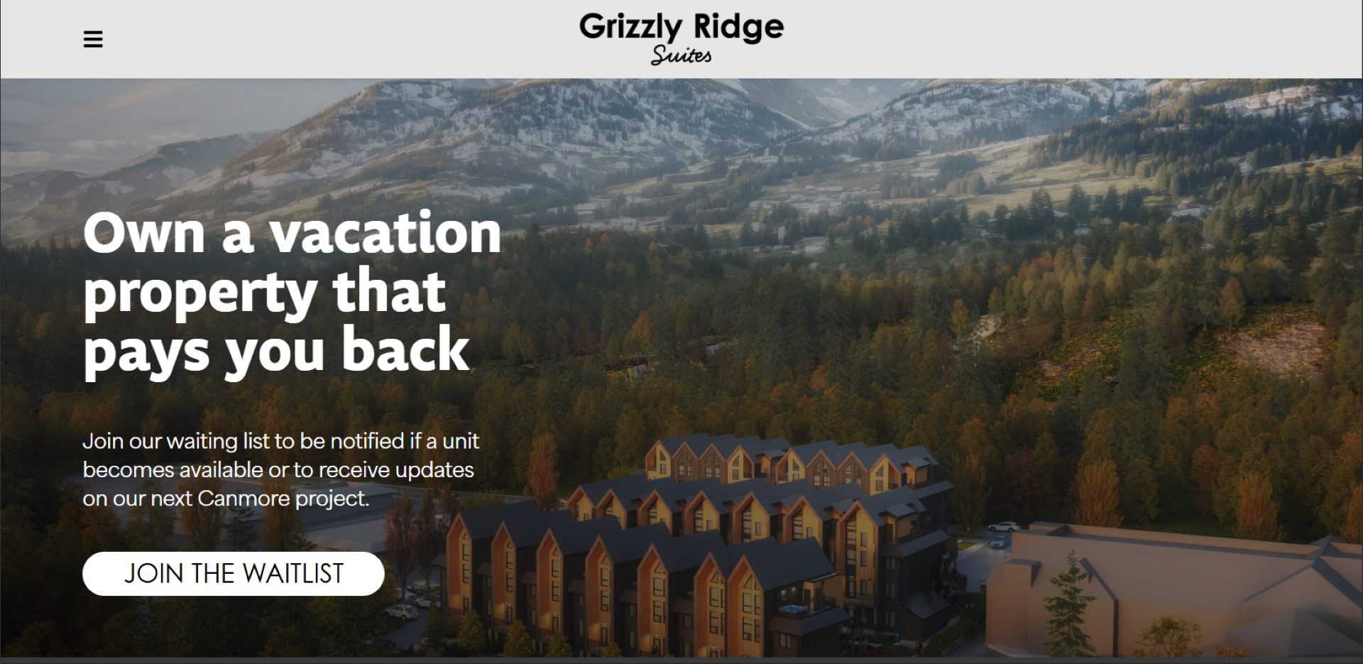 A custom promotional website designed for Grizzly Ridge Suites, a premier vacation property development located in the heart of the Canadian Rockies in Canmore, Alberta. The site showcases a mountain-modern collection of fully appointed suites tailored for both personal retreats and high-yield short-term rental investment opportunities. Featuring compelling visuals, clear unit information, amenity highlights, floor plans, and proximity to iconic destinations like Banff, Jasper, and Yoho National Parks, the website delivers a clean, engaging user experience that inspires visitors to join the waitlist and explore ownership.